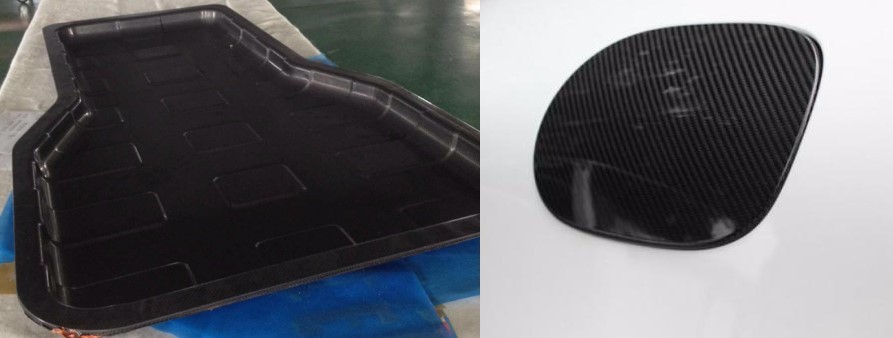 預(yù)浸帶材料采用模壓+注塑的工藝可以生產(chǎn)處汽車的安全氣囊盒、座椅的靠背、汽車的剎車踏板連桿、車門內(nèi)架模塊、車頭車尾的模塊、發(fā)動(dòng)機(jī)保護(hù)板等等。