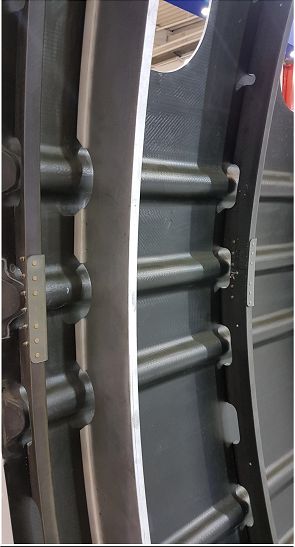 創(chuàng)新機(jī)身壁板長(zhǎng)桁不再是單獨(dú)預(yù)先制造出來(lái)。長(zhǎng)桁由碳纖維 QISO? 準(zhǔn)各向同性織物預(yù)浸片制成。先將預(yù)浸片放置在開槽的機(jī)身模具表面。然后,使用真空成型,預(yù)浸片被拉入長(zhǎng)桁圓弧凹槽,形成具有長(zhǎng)桁圓弧凹槽波紋的長(zhǎng)桁板。接著,就像波音 787 或者 A350 機(jī)身中段曲面板所做的一樣,用自動(dòng)鋪絲機(jī)(AFP)鋪放 T1100/3960 纖維帶,制造機(jī)身蒙皮。再在熱壓罐中固化。結(jié)果是機(jī)身蒙皮具有連續(xù)的內(nèi)表層,并具有完全集成的長(zhǎng)桁。創(chuàng)新工藝最突出的亮點(diǎn)是: